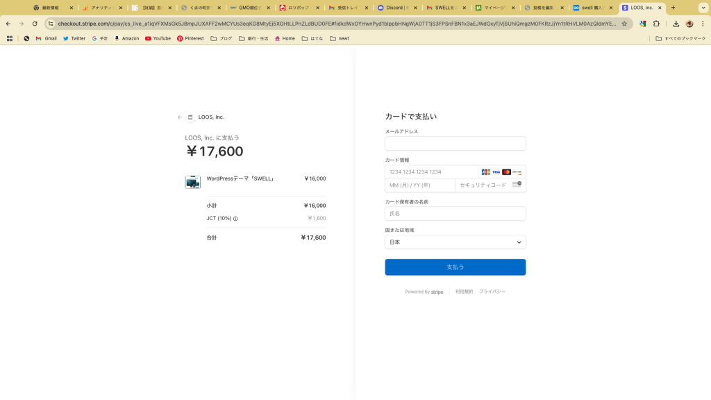 メールアドレス、クレジットカード等の支払い情報を入力します。